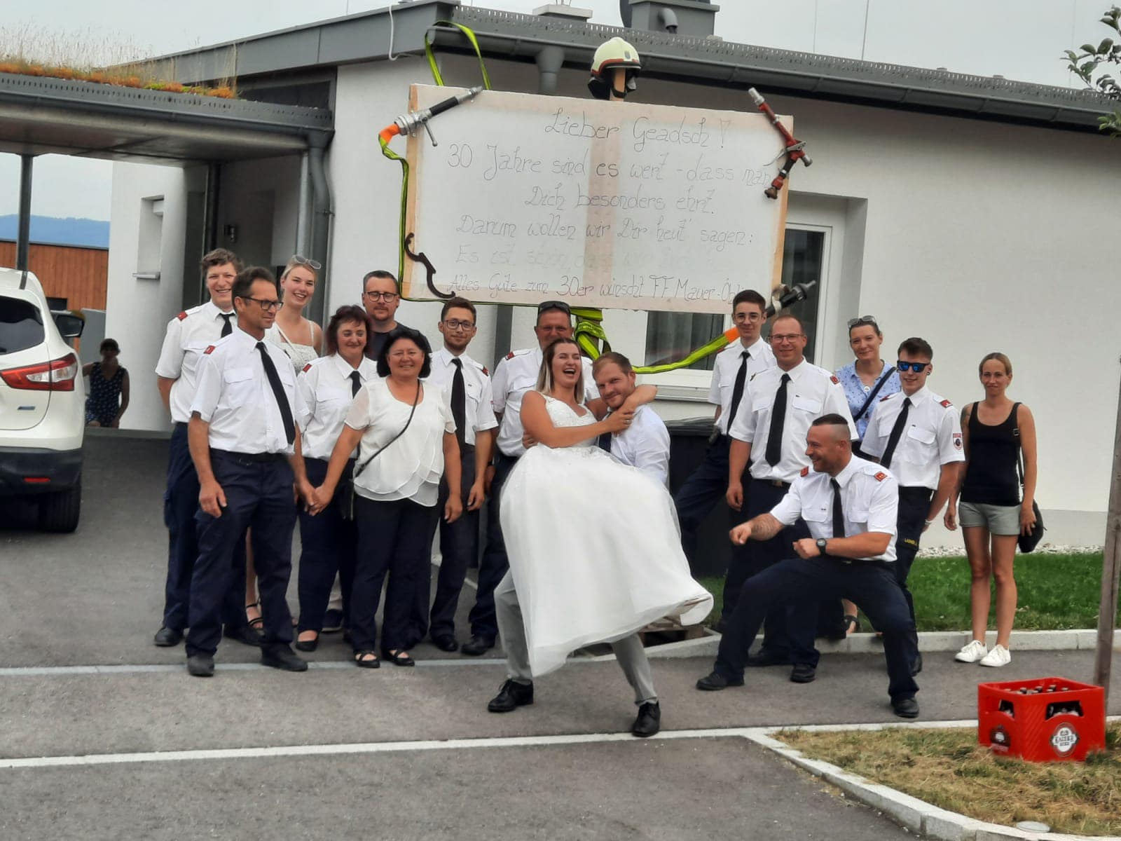 Am 29. Juni heiratete unser SB Atemschutz Gerald Hinterleitner seine langjährige Freundin Chiara. Eine Abordnung unserer Feuerwehr gehörte zu den Gratulanten und überraschte das Brautpaar mit einem Geschenk.